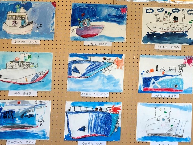 年長組さん51人が貨物船の絵を描きました。見学後に、子ども達の目線で描くそれぞれの貨物船。かつて、フェリー乗り場だった施設にぴったりな展示です。