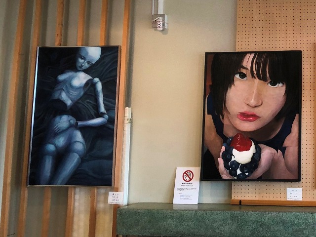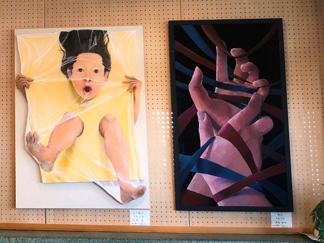 愛媛県高等学校総合文化祭、県展に出品したオリジナリティあふれる力作7点を展示。高校生の内面から湧き上がる心を表現した作品は見応えありです。